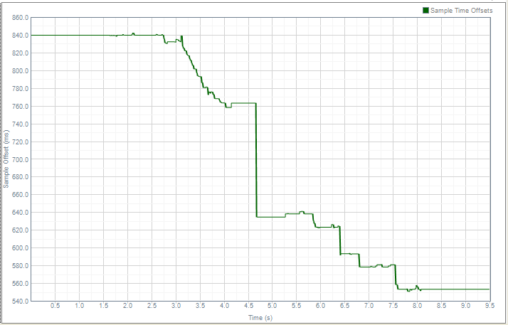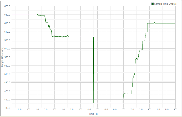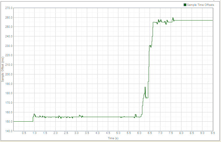 The glitch at about 6.5s is audible and seems to correspond to the delay variation shown above at about the same time. Listen