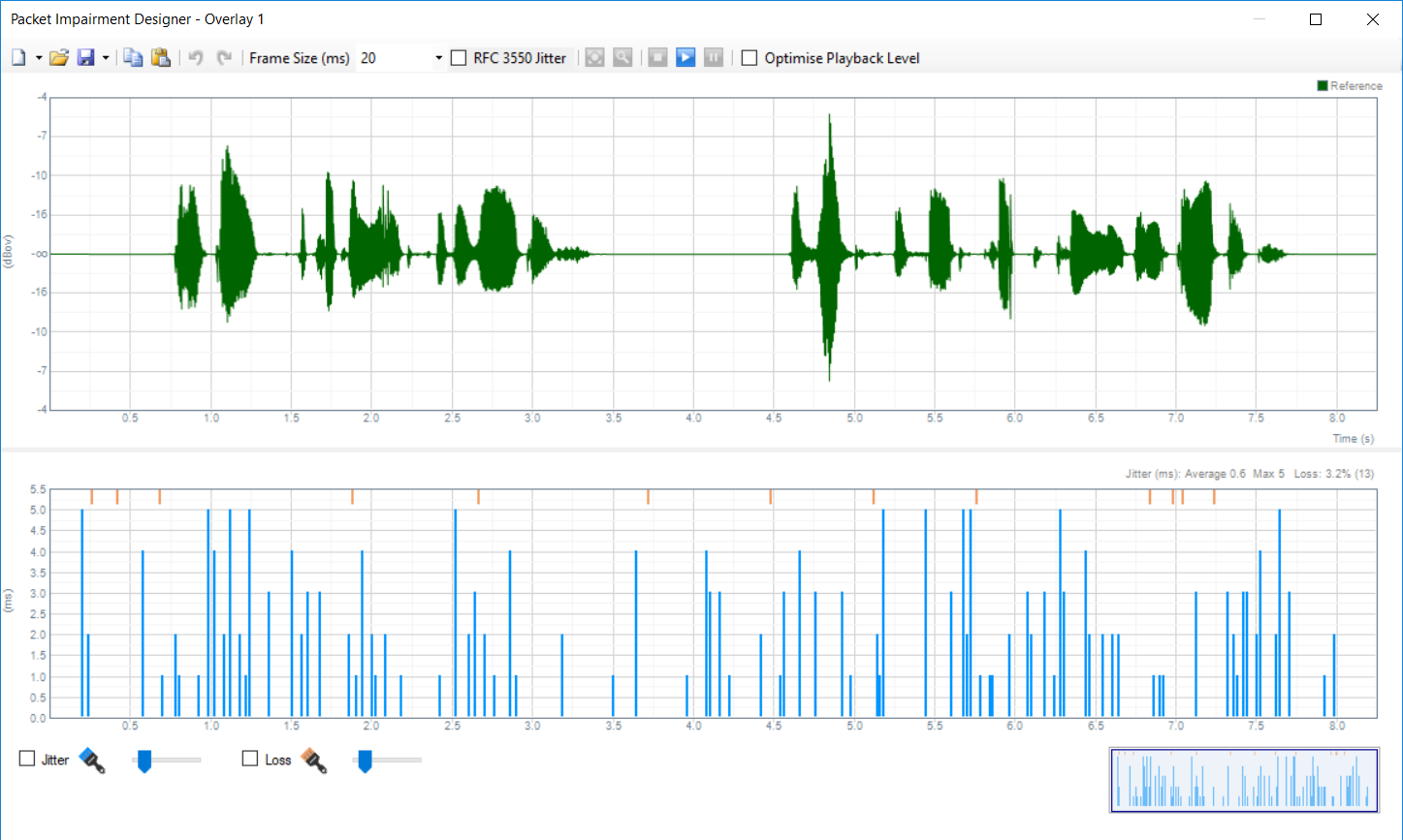 - The effect of packet loss on voice quality depends on whether the loss occurs during an active speech segment or during a silence interval. The Overlay method ensures that the loss and jitter pattern maps precisely to the speech sample used, thus ensuring complete repeatability. It follows that if the loss and jitter pattern were to be offset in relation to the speech sample, different results could be obtained. This can be easily exploited to extend the usefulness of each Overlay, by specifying an offset of say 0 to 99 packets, with a step size of 1 packet. Using this simple setup, shown below, a set of 100 results per speech sample are obtained for a single Overlay. This sophisticated test is achieved with a simple MultiDSLA tasklist, as seen here: