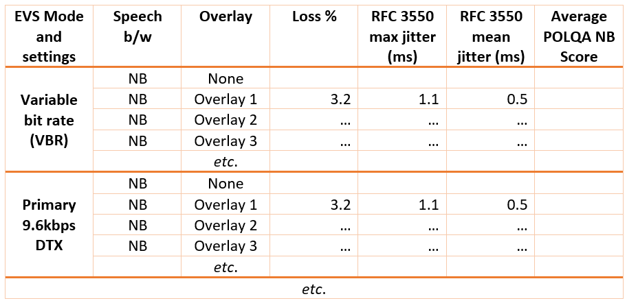 The table below shows a sample Test Plan built around a number of packet impairment overlays which are used with each of a number of EVS Mode selections in order to characterize and compare the modes in terms of voice quality and network bandwidth efficiency. The ‘Average POLQA Score’ would typically be calculated from the individual scores obtained for two different female and two different male voices.