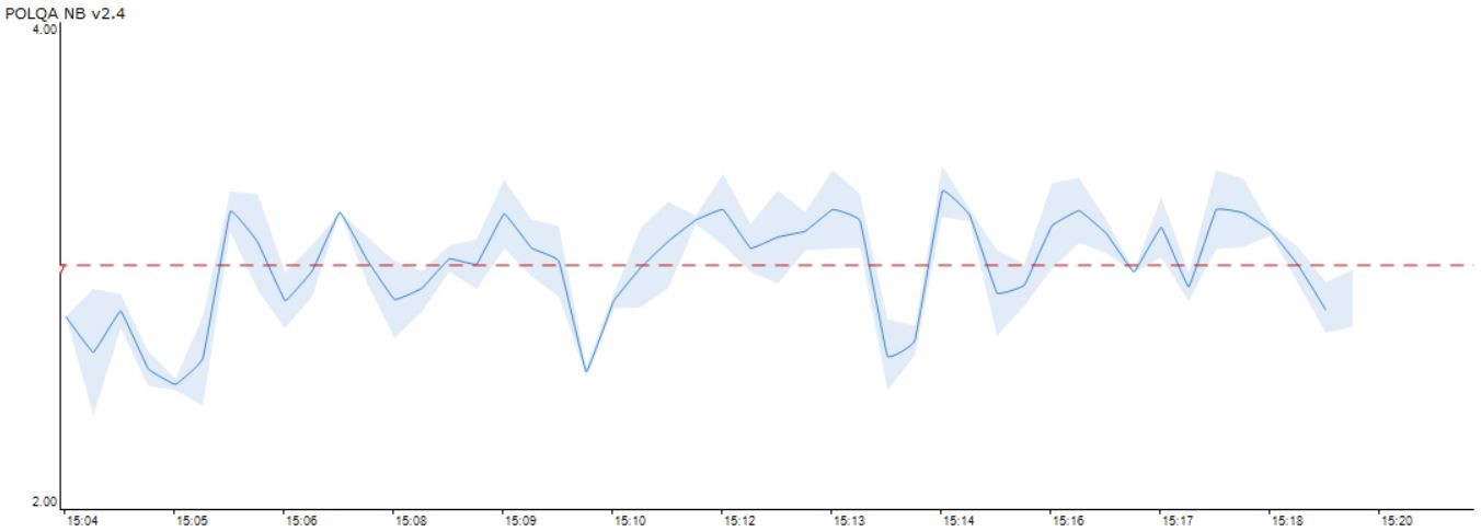 This Trend report graph shows a set of 100 scores using the above configuration with the Female 1 speech sample. The graph maps the successive POLQA scores as the Overlay impairment pattern is advanced by one packet at a time, in relation to the speech sample. The dotted red line is set at 3.00.