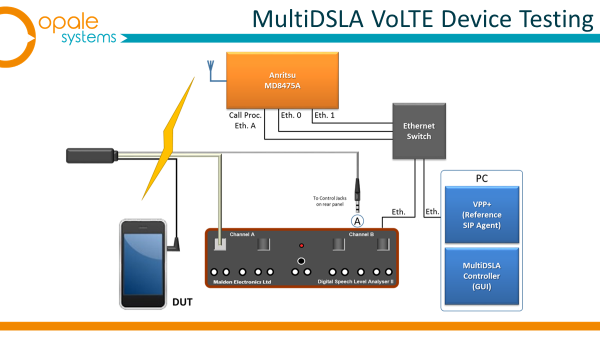 This diagram shows the MultiDSLA application controlling both the DSLA and the VPP+. Test calls are made between the VoLTE device (DUT) and the VPP+ and both are registered to the IMS server associated with the reference base station. Either terminal may originate the call, so both Mobile Originated (MO) and Mobile Terminated (MT) modes of call setup are possible.