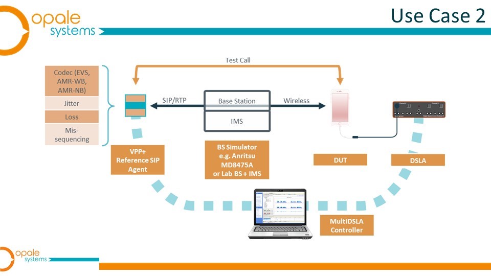 This use case employs the MultiDSLA test system with a DSLAII and a VPP+, plus a VoLTE reference base station (base station emulator). A clean, isolated network is required, as for Test Case 1 – this is ideally provided by an Ethernet switch as shown here. The packet impairment techniques outlined for Use Case 1 may also be used in this application.