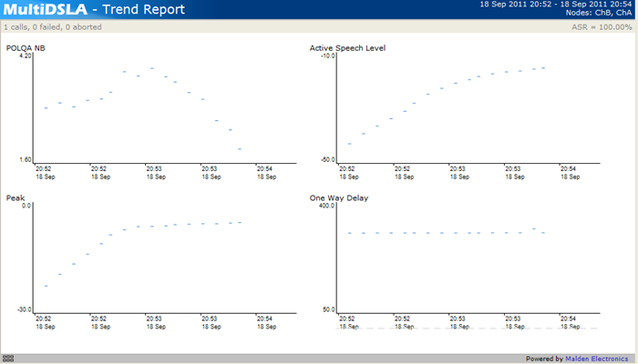 The POLQA NB graph in the upper left-hand corner shows clearly how level alone influences the measured speech quality. The curve may be smooth or erratic, depending on network type and conditions. If the curve is erratic, try repeating the test one or more times.