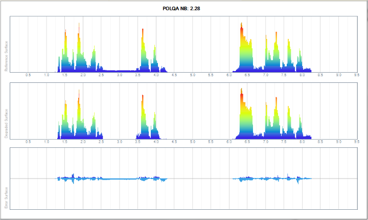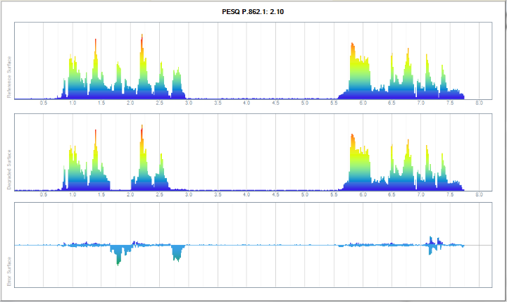 POLQA’s time alignment algorithm searches for sections of the reference file in the degraded file. This results in the parts of reference signal being moved to align with sections in the degraded signal. Consequently the POLQA 2D surface view shows the reference signal time aligned to the degraded signal. This can lead to the reference surface appearing to be significantly different from what was played into the network or device under test. The example below highlights the difference from an unusual measurement.