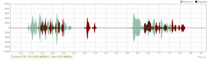 It would appear that there is a one second gap in the first utterance in the reference file according to POLQA. However, the reference surface looks normal in the PESQ view. In fact, the network delayed the last part of the first utterance by almost one second as shown in the waveform view below. The waveform view shows the reference file that has been generated by MultiDSLA for POLQA and the degraded file that has been captured by the receiving node. Neither has been altered before presentation in the waveform view.