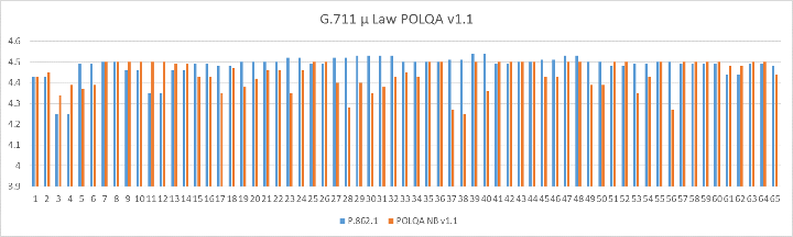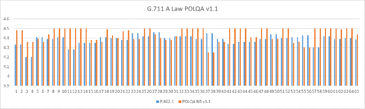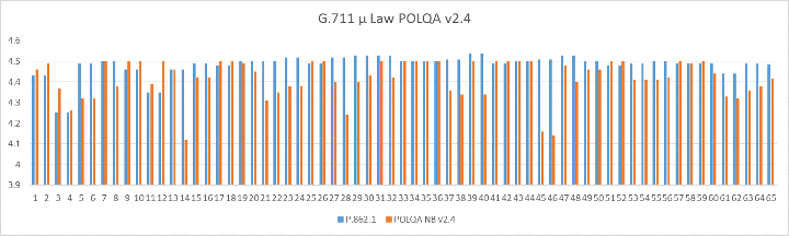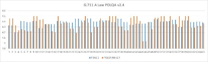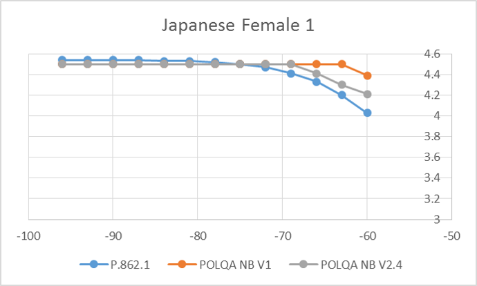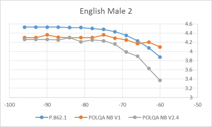 ITU-T Rec. P.863 v2.4 works rather differently from v1.1. Many aspects of the algorithm have been modified. Consequently, the performance differs from v1.1 in some respects. POLQA v2.4 is more sensitive to speaker and language. Some examples are shown below.