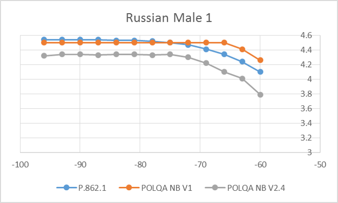 These three examples are of the best and worst speaker sensitivities in a larger set of tests. POLQA v1.1 exhibited some speaker sensitivity but v2.4 may show more. There is almost no difference in the score between v1.1 and v2.4 for the Japanese female speech but the English male speech shows a greater range. The Russian male speech is consistently 0.2 MOS lower when evaluated by v2.4.