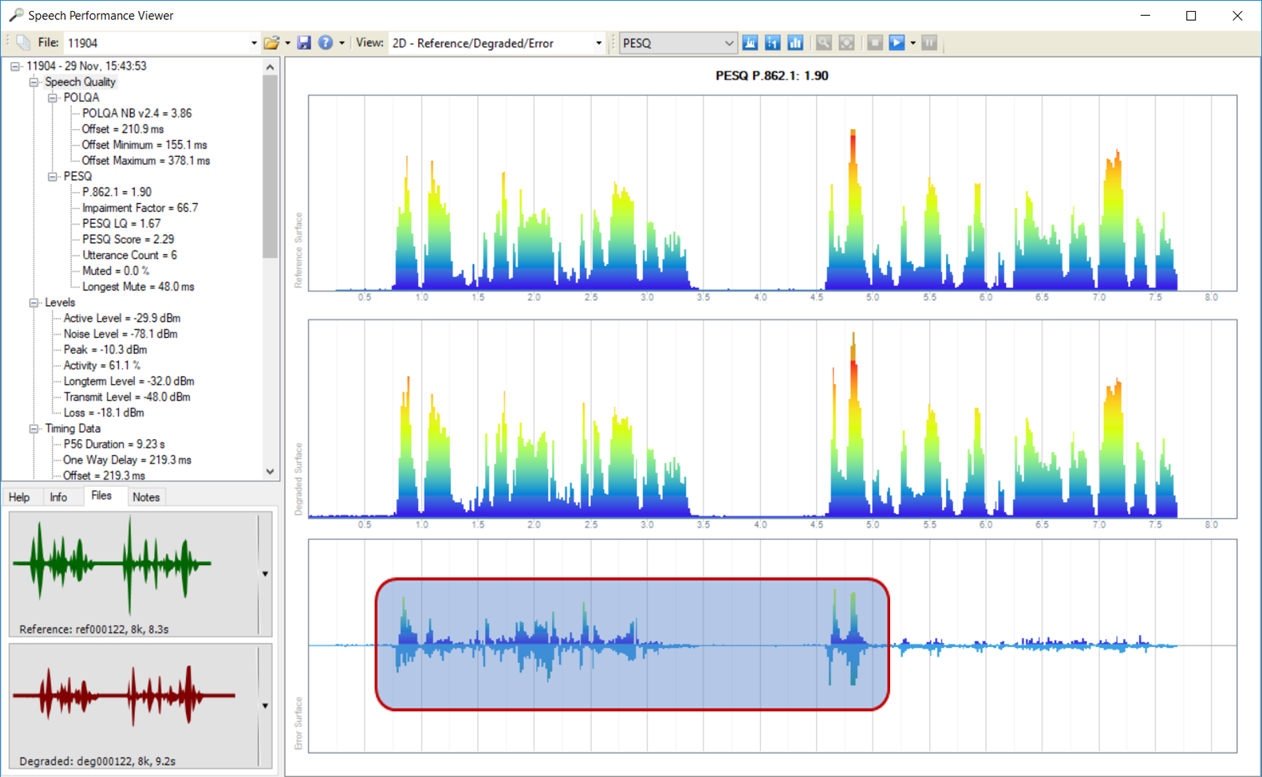 Next, there's a visual clue, clear enough in the screenshots above. The weakest of the three traces - the "error surface" in the POLQA analysis - shows small, but fairly consistent errors. The same trace in the PESQ analysis (highlighted) shows larger errors throughout the first sentence and right at the beginning of the second. What is going on?