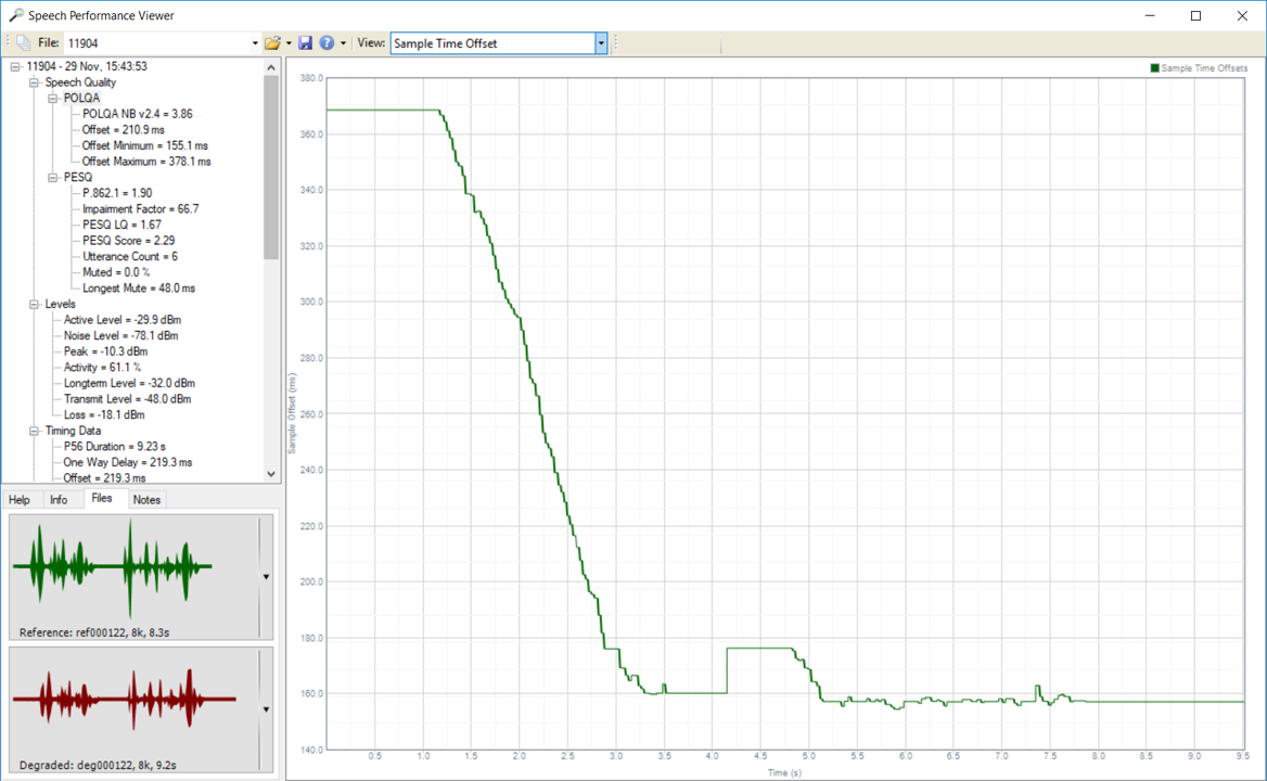 POLQA tells us that during the first of the two sentences, the one-way latency (delay) decreases by more than 200 ms over a period of about 2.1 s. POLQA indicates that this is an approximately linear fit, corresponding to a speech "speed-up" of about 9.5%. Interestingly, speech pitch appears normal while this is occurring. One would expect that "speeding up" speech by nearly 10% would raise the pitch, but that is not what we hear.