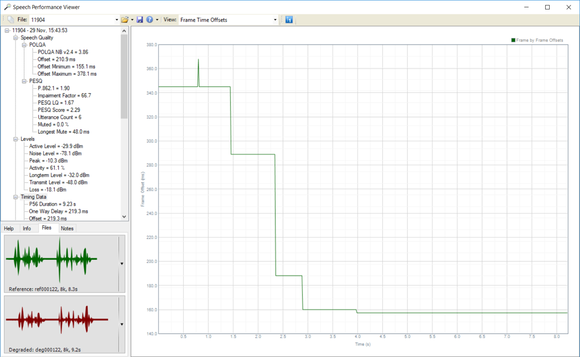 Listening to the degraded signal alone doesn't reveal much. In fact, it sounds reasonably good, not excessively distorted, and there are no "gaps" in the speech. But then listening to the reference signal a few times reveals something interesting - the speech in the degraded signal actually comes out faster during the first of the two sentences!