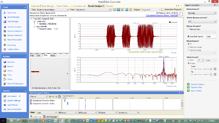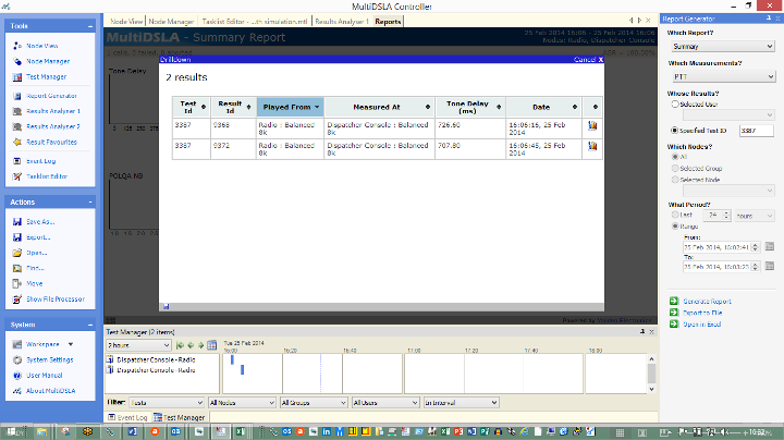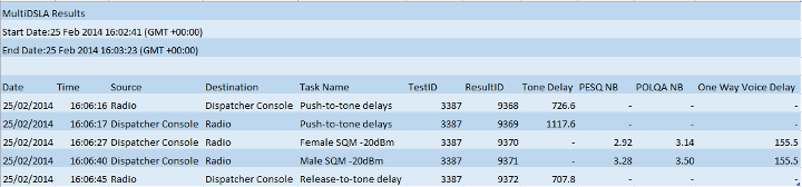 Opale Systems MultiDSLA voice quality test system has the flexibility to meet the test requirements outlined above. Opale Systems offers an economical design and build service for the special test cables required for testing all types of PTT equipment and services. The flexible test design features in MultiDSLA mean that it is easy to create or modify tests which recognise specific tones generated in PTT terminals and devices, and measure the tone timings. MultiDSLA’s hardware features programmable switches which automate PTT operations in conjunction with the test cables. The test sequence combines PTT operations, tone delay measurements (if required), multi-speaker voice quality assessment and voice latency/delay. The test process can operate as a single-shot, returning a few measurements, or as a repeating or continuous test, with statistical and trend reporting.