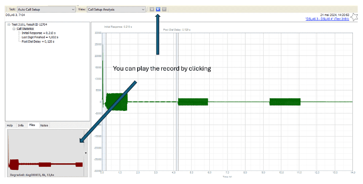 By viewing a result within MultiDSLA GUI or through SPV, you can listen to the recorded call setup: