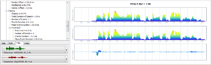 Figure 4 shows how MultiDSLA detects that the beginning of a prompt is missing. The prompt says something like “Thank you for calling the speech-enabled auto-attendant”, but the initial “th” sound is missing. PESQ reports a Confidence of over 80%*, suggesting that the correct prompt has been heard, but also shows that a 62ms portion is missing at the front end.