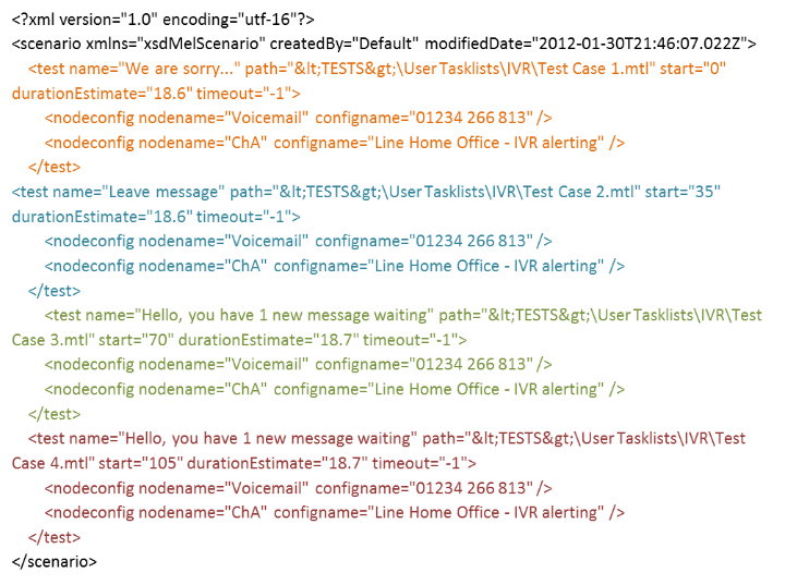 You may need to build a number of tasklists to test the different stages of the IVR transactions. Running these individually is tedious, but they can be combined in a Scenario such that they function in sequence. The example Scenario below shows how four tests have been combined to create a test suite which performs these steps:
