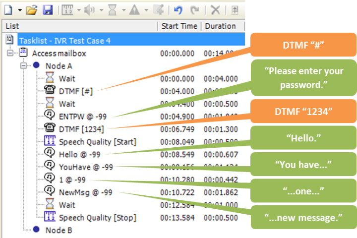 If you want the test system to trigger the prompts, program the necessary steps (DTMF sequences and/or speech files and waits) in place of the Wait event. Once you have a recording, use a third party wave file editor such as Adobe Audition or Audacity to save prompts to separate files.